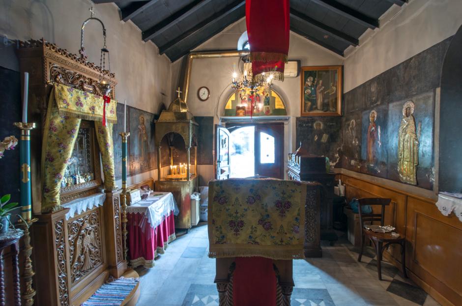 Die Fenster der Kirche sind schmal, relativ klein und ähneln Schießscharten. Im Innenraum, an der Nordwand, erkennt man die Wandmalereien der Heiligen Marina, der Heiligen Irene, der Heiligen Paraskevi, des Heiligen Dimitrios und des Heiligen Ierotheos. Wandmalereien sind auch an der Südwand zu finden, wie die der Heiligen Filothei, der Enthauptung Johannes des Täufers, der Heiligen Ekaterini und der Heiligen Kyriaki.