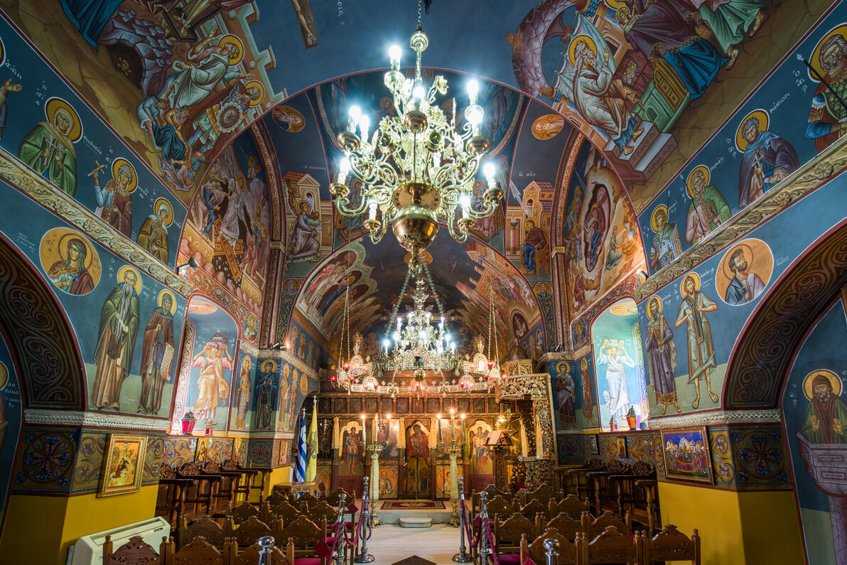 Ο ναός κτίστηκε στα χρόνια της Τουρκοκρατίας, στα τέλη του 18ου αιώνα. Είναι μεγάλος, μονόχωρος, θολοσκεπής, με σταυροειδώς διατεταγμένες καμάρες. Είναι κτισμένος με καλά κατεργασμένους λίθους και ξεχωρίζει για το εντυπωσιακό αλλά και κομψό, πενταώροφο κωδωνοστάσιό του, που είναι ορατό από μακριά, και, όπως μας πληροφορεί η εντοιχισμένη επιγραφή, προστέθηκε το 1836. Ο δεκάπλευρος τρούλος του ναού και η πεντάπλευρη αψίδα του ιερού διακοσμούνται εξωτερικά με μικρούς μαρμάρινους κίονες και μαρμάρινα τόξα με ανάγλυφα στοιχεία, ενώ ανάγλυφα είναι και τα θυρώματα και τα πλαίσια των παραθύρων.