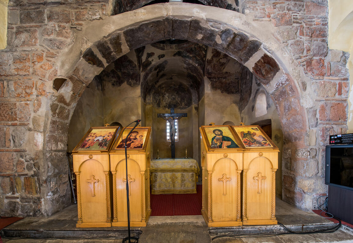 The walls of the Byzantine church are rather carefully constructed, built with the Byzantine cloisonné masonry and are decorated with beautiful ceramic elements, such as dentil courses, meanders and crosses. The older church is built with stones and is characterized by several Venetian architectural elements, like the doors and the small round window. At its interior, the Byzantine small church still has parts of the wall paintings that probably date from the 16th-17th century, while the newer church has no icons.