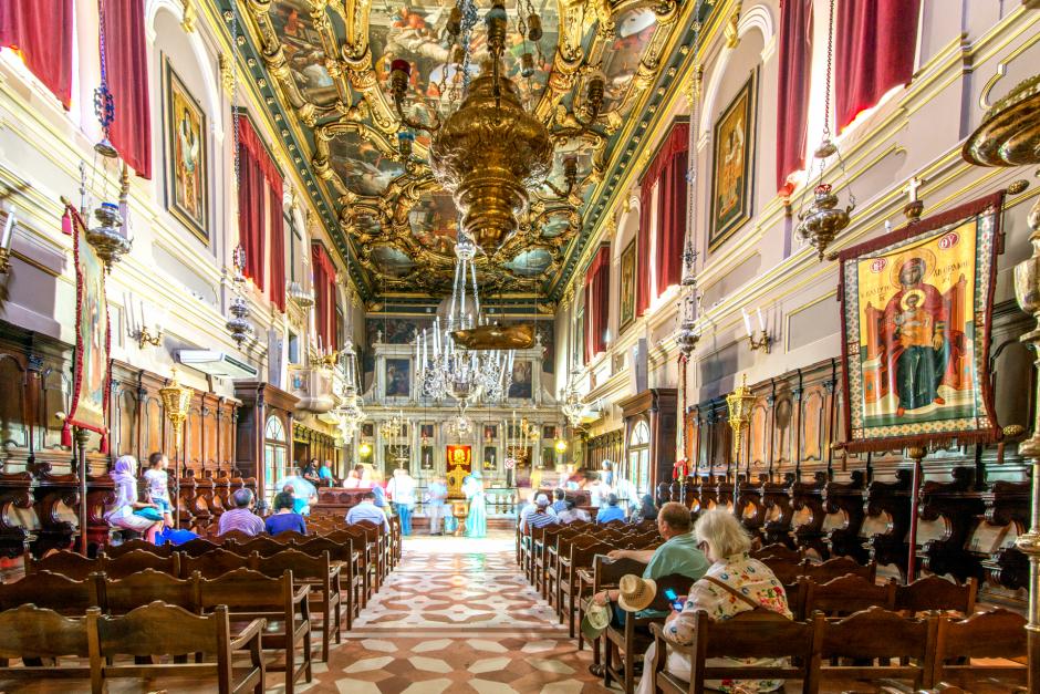 At the church’s interior what is impressive is the “ourania”, the illustrated flat roof, the first example of this type in Corfu. It was created in 1727 by the important painter from Corfu Panagiotis Doxaras, and consists of seventeen sections, which depict scenes from the life of Agios Spyridon inside gold frames. Then initial icons were destroyed by humidity and in 1852 they were restored by the painter Nikolaos Aspiotis. Other important works are the Crucified, of the 17th century, which is attributed to the famous Cretan painter Emmanuel Tzane Bouniales, as well as the icon of Agias Loukias, work of the painter from Corfu Spyridon Sperantzas, in 1772.