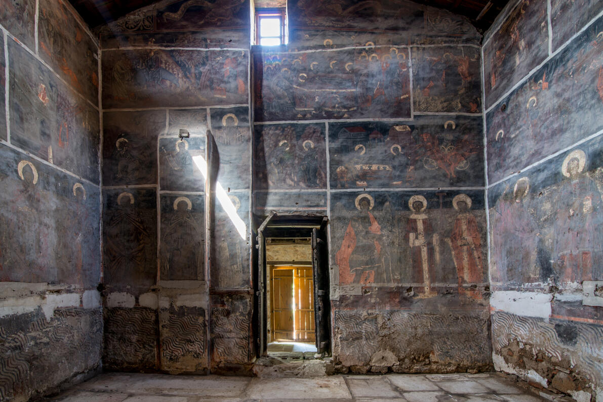 At its interior it was decorated with icons that belong to three stages. The older ones are from the 14th century and survive in fragments, while from the icons of the end of the 15th century survive representations on the external western and southern wall. As the inscription over the entrance of the church mentions, the renewal of the icons was made in 1589, with the funding of wealthy “Mr. Kostis” and is the work of a local painter. At the main church, the representations are organized in three zones: at the upper one there are scenes from the Dodekaorton (the twelve most important celebrations in the year), in the middle scenes from the life of Prophet Elias and other themes and in the lower the full figures of saints. Particular interest has the rare, marble screen, which belongs to the initial stage of the construction of the church, but at a later period it was reshaped with the closing of the openings and the depiction on the surfaces that were created of the enthroned figures of Christ and Virgin Mary.